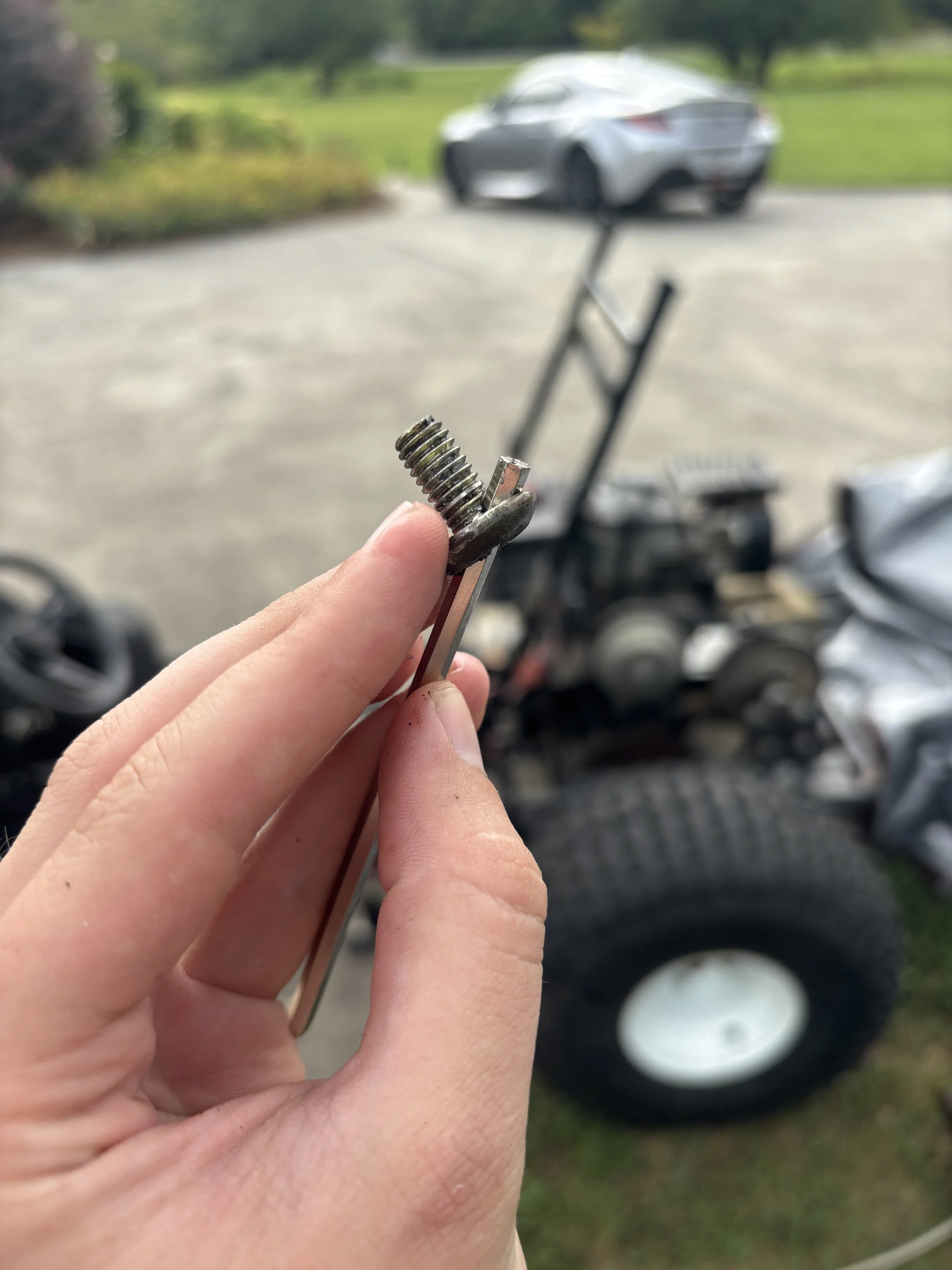 The first step was to remove as much rust from the frame as I could. To do that I disassembled the frame of the go-kart in order to access rust that was not visible while it was put together. This process was not easy and took almost two full days of work to do. The age and usage of the vehicle means that almost every bolt on it was rusted in place or had been stripped. This lead to the solution pictured below.